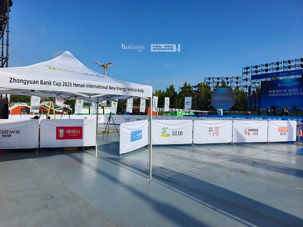 不銹鋼鐵馬護欄在場地中率先就位,它們以硬朗的身姿劃分出不同功能區域。每段 1.5 米長的鐵馬整齊排列,相互間用牢固的連接件緊密咬合,形成堅不可摧的屏障。為契合賽事主題與宣傳需求,鐵馬護欄外包裹著白色底色的廣告布,品牌名稱以醒目的字體印于其上,在日光下清晰可見,既起到隔離防護作用,又成為流動的廣告載體。
